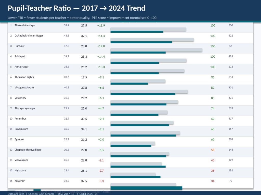 On March 28th 2026, OpenCity conducted a datajam in Chennai on the topic of Constituencies. Abdullah, Harini, Kathir, Prasanna and Santhosh looked at the state of government schools in the sixteen constituencies in Chennai district. They used data from the Unified District Information System for Education Plus (UDISE+) 2023-24, compared it with the equivalent data from 2017-18 to understand the change (improvement or deterioration) over the years.