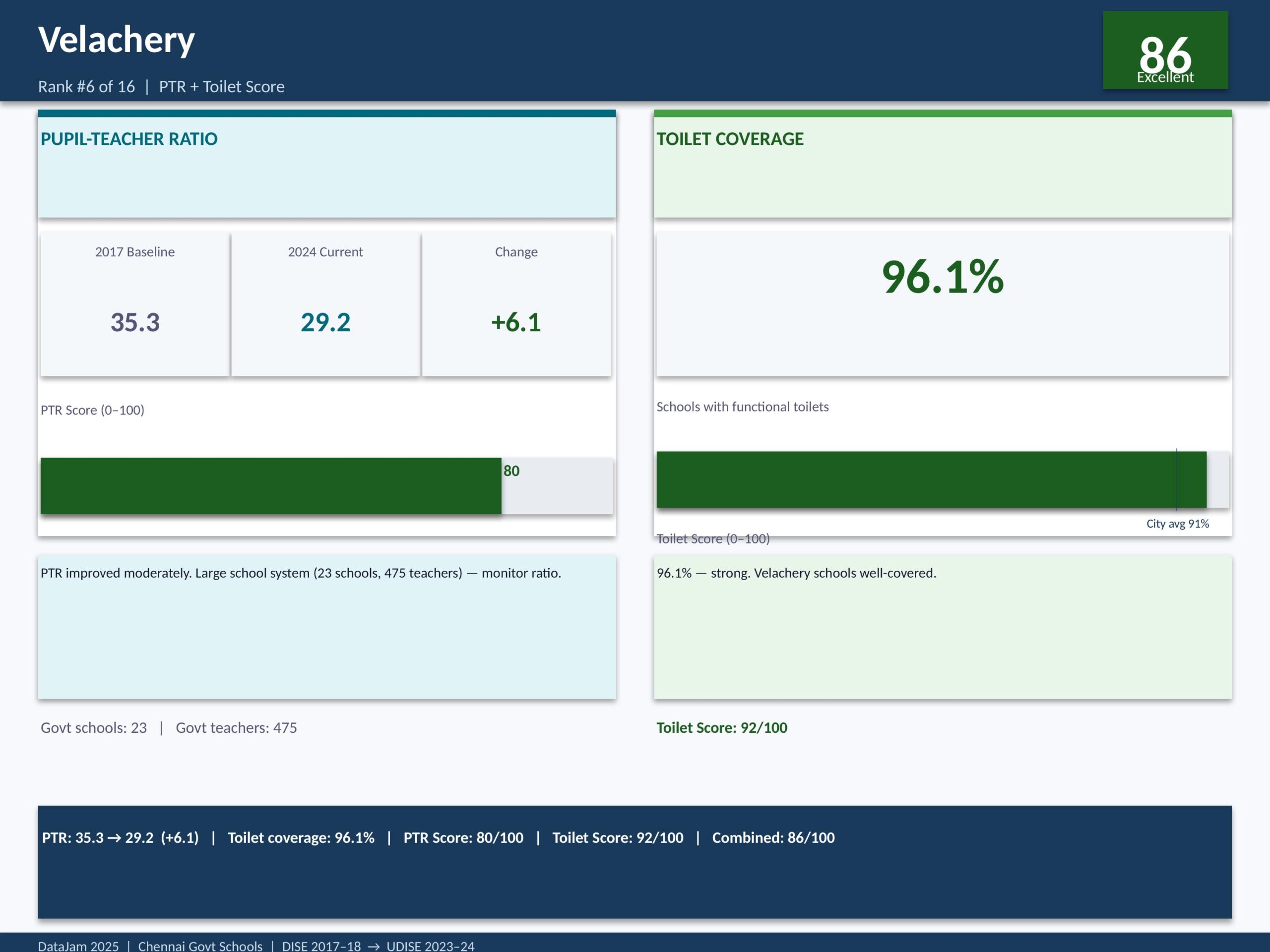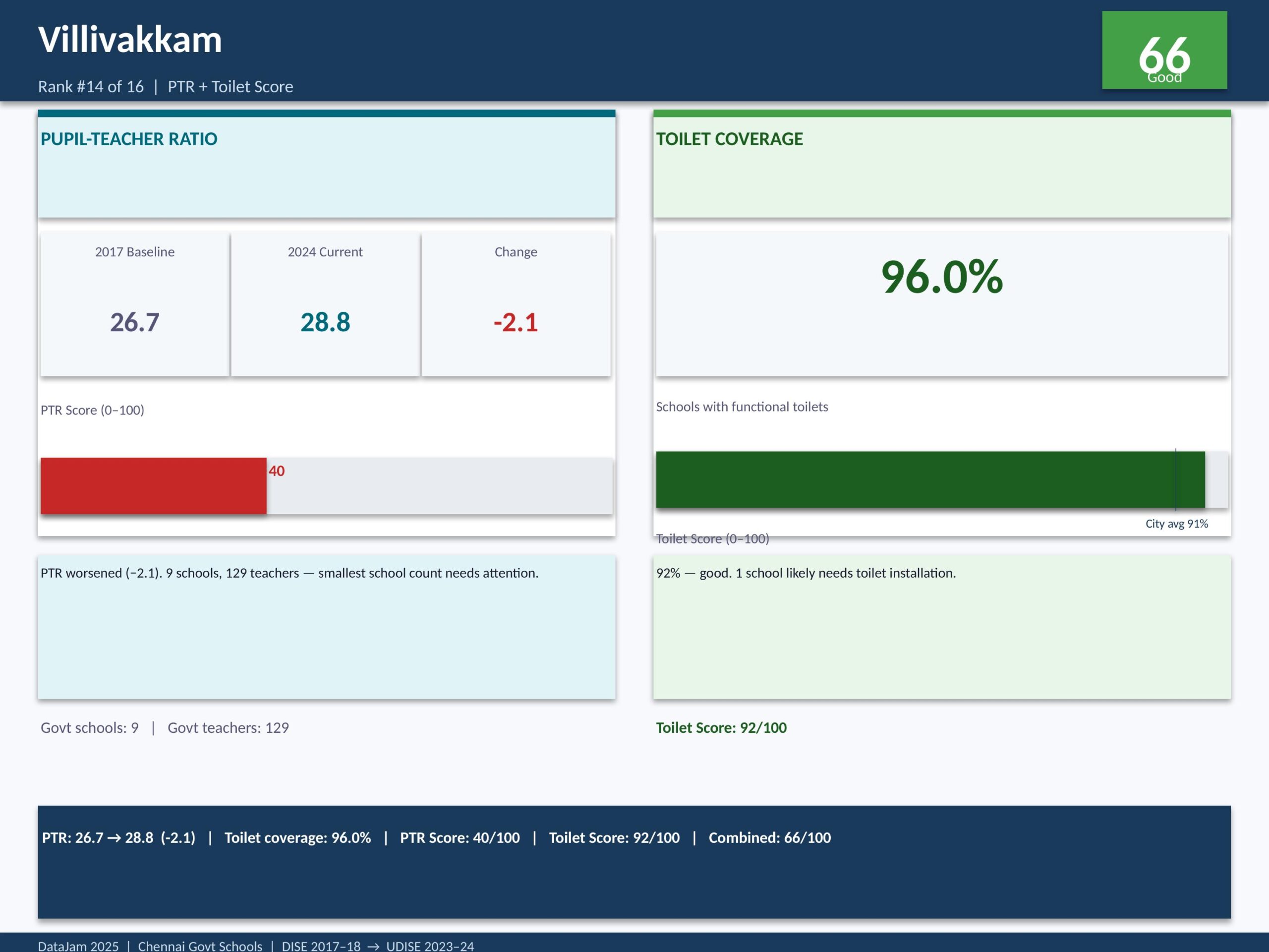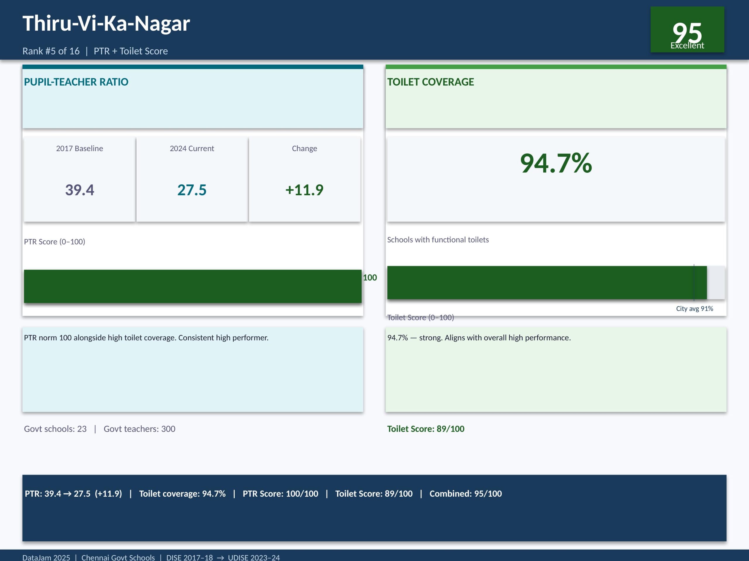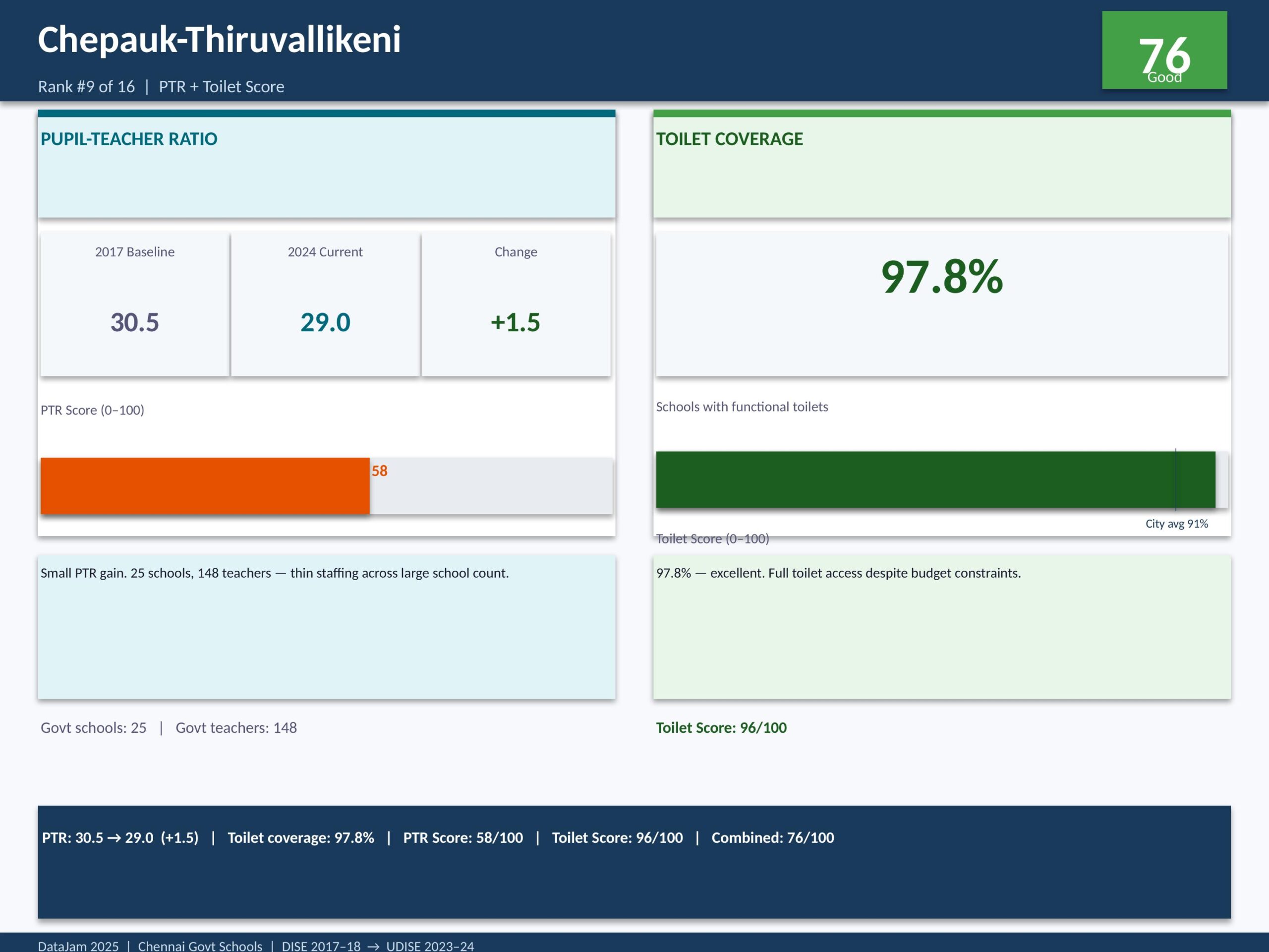 On March 28th 2026, OpenCity conducted a datajam in Chennai on the topic of Constituencies. Abdullah, Harini, Kathir, Prasanna and Santhosh looked at the state of government schools in the sixteen constituencies in Chennai district. They used data from the Unified District Information System for Education Plus (UDISE+) 2023-24, compared it with the equivalent data from 2017-18 to understand the change (improvement or deterioration) over the years.