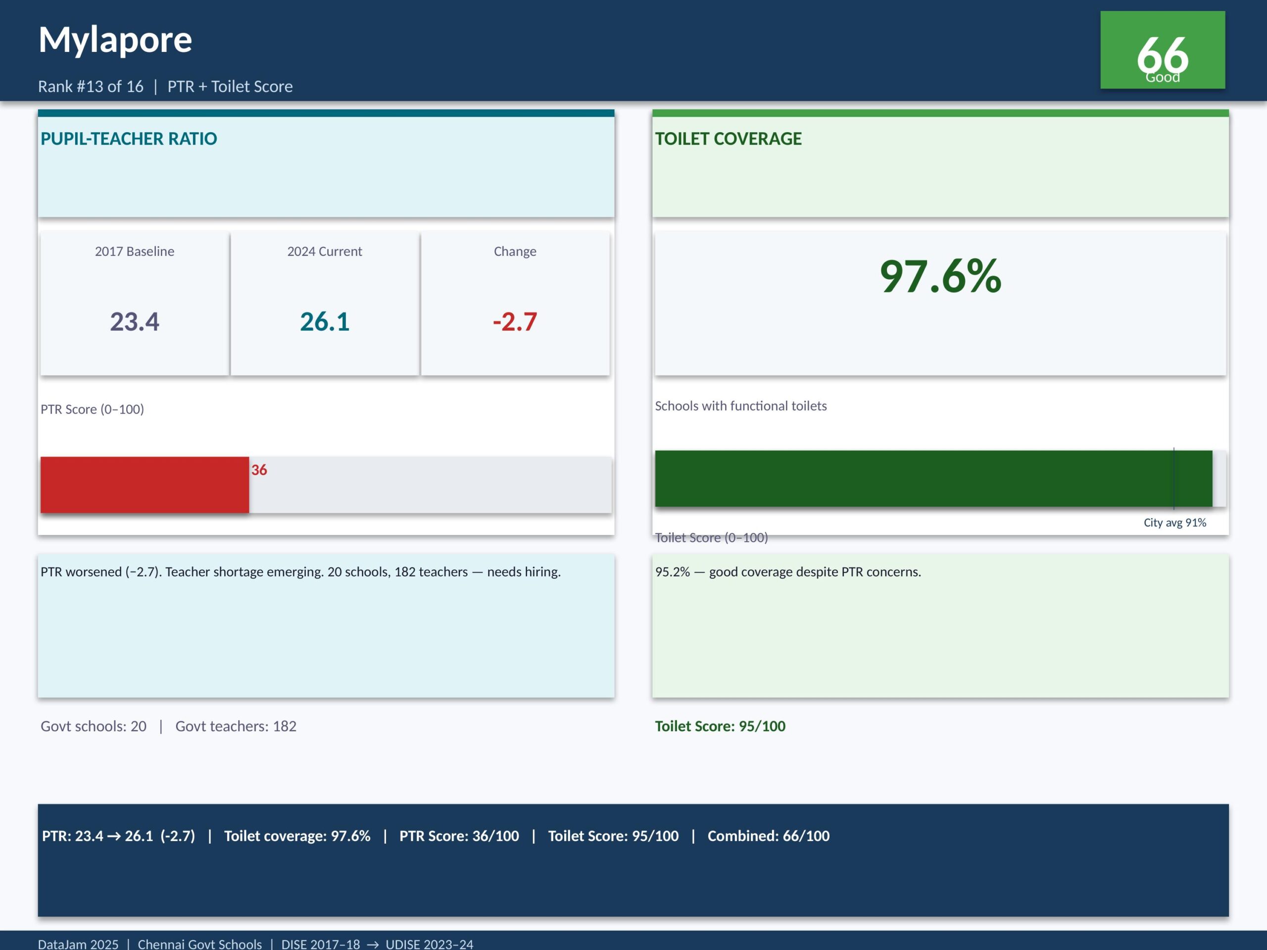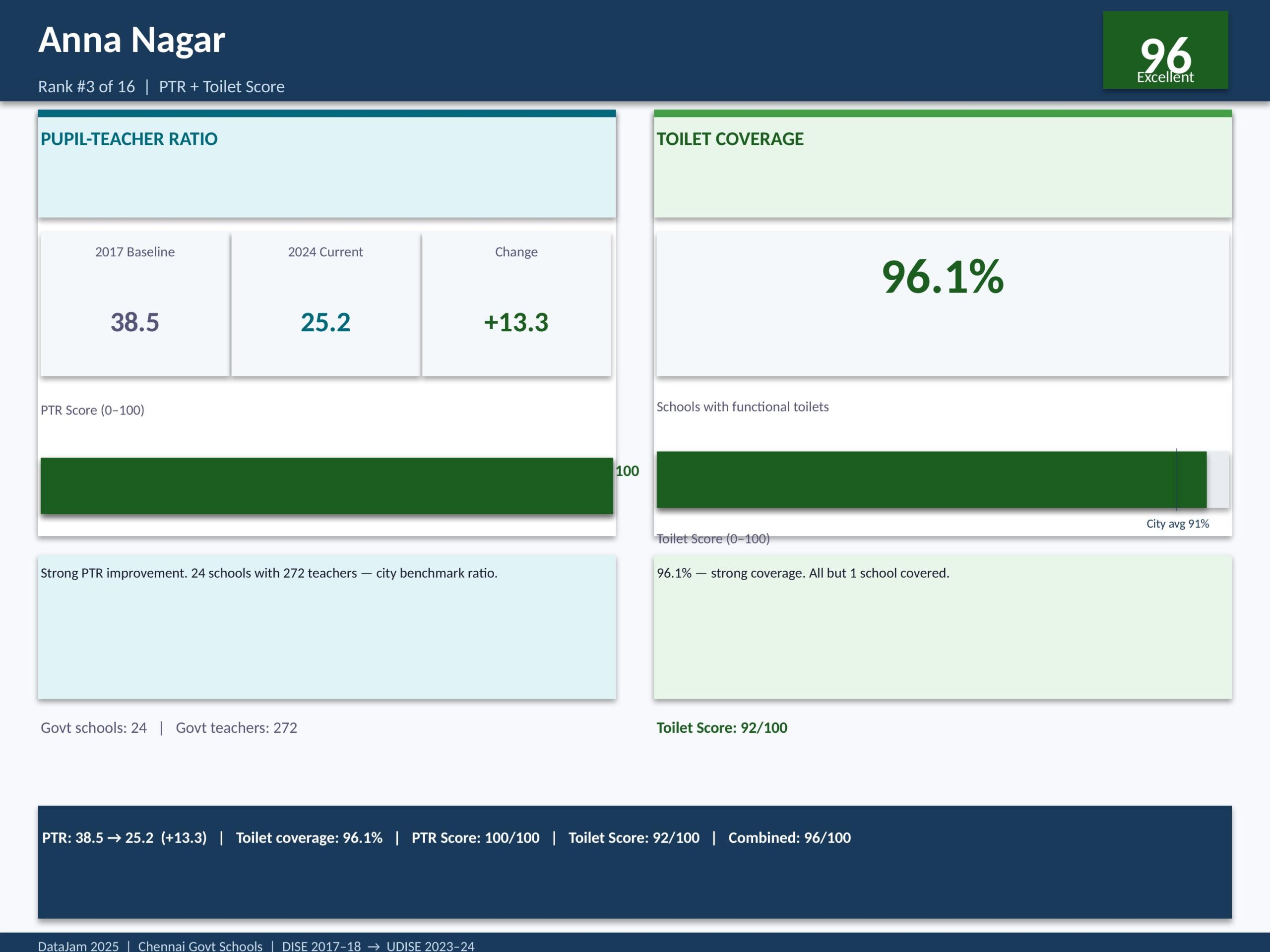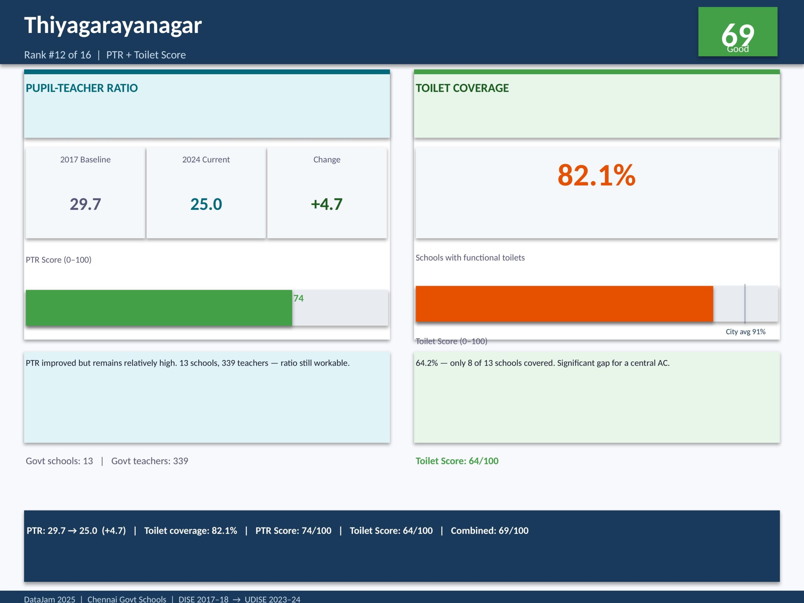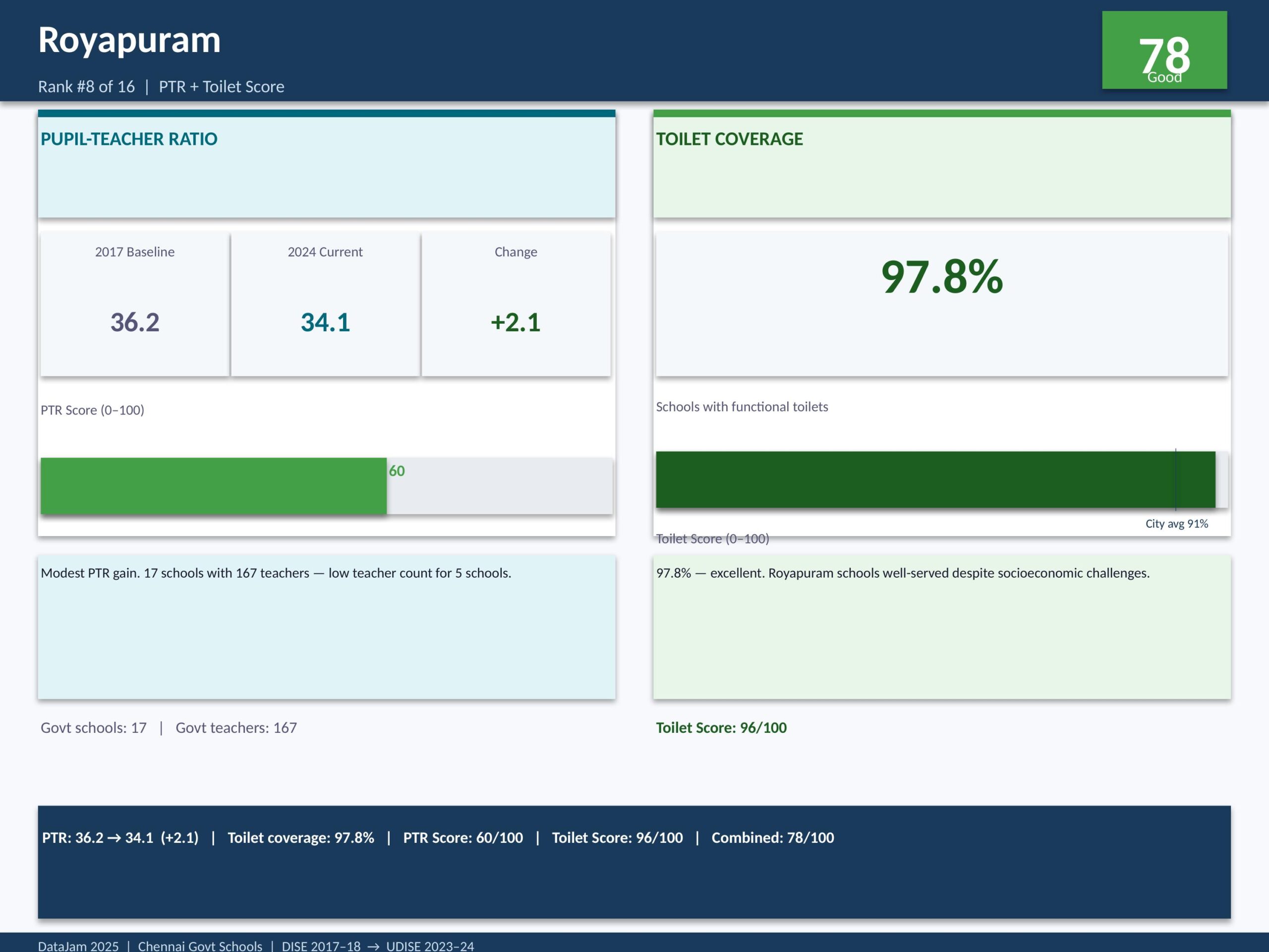 On March 28th 2026, OpenCity conducted a datajam in Chennai on the topic of Constituencies. Abdullah, Harini, Kathir, Prasanna and Santhosh looked at the state of government schools in the sixteen constituencies in Chennai district. They used data from the Unified District Information System for Education Plus (UDISE+) 2023-24, compared it with the equivalent data from 2017-18 to understand the change (improvement or deterioration) over the years.