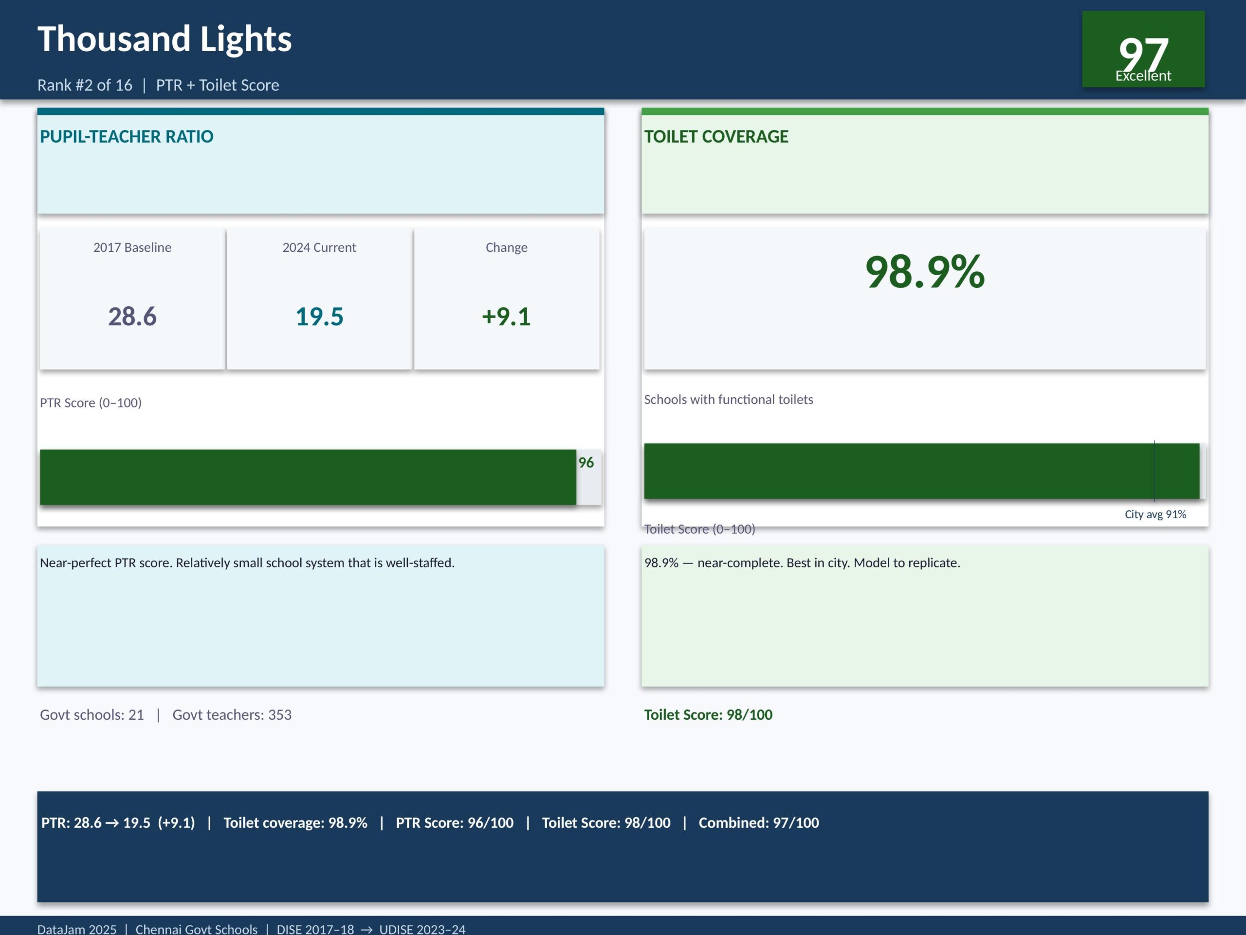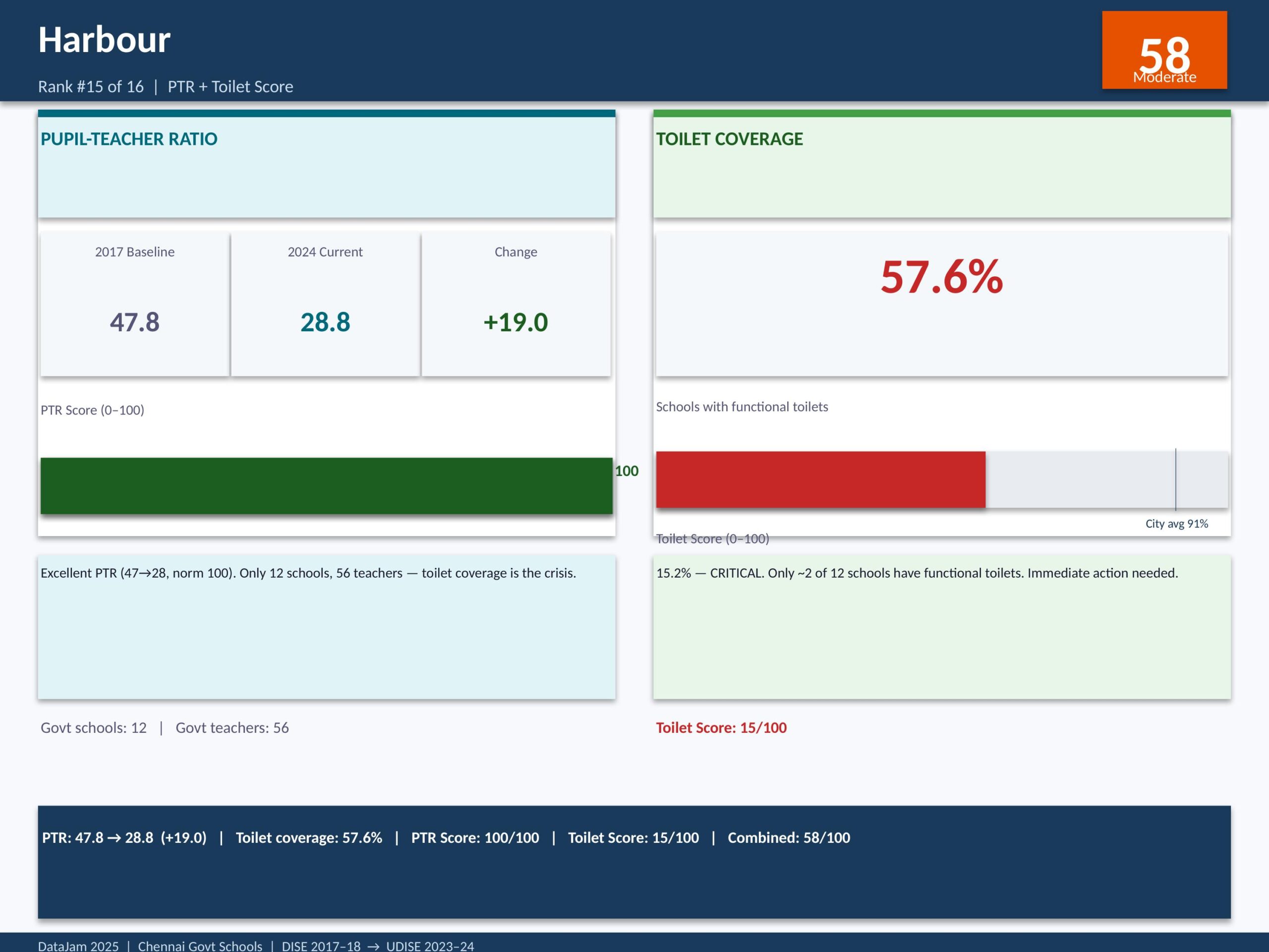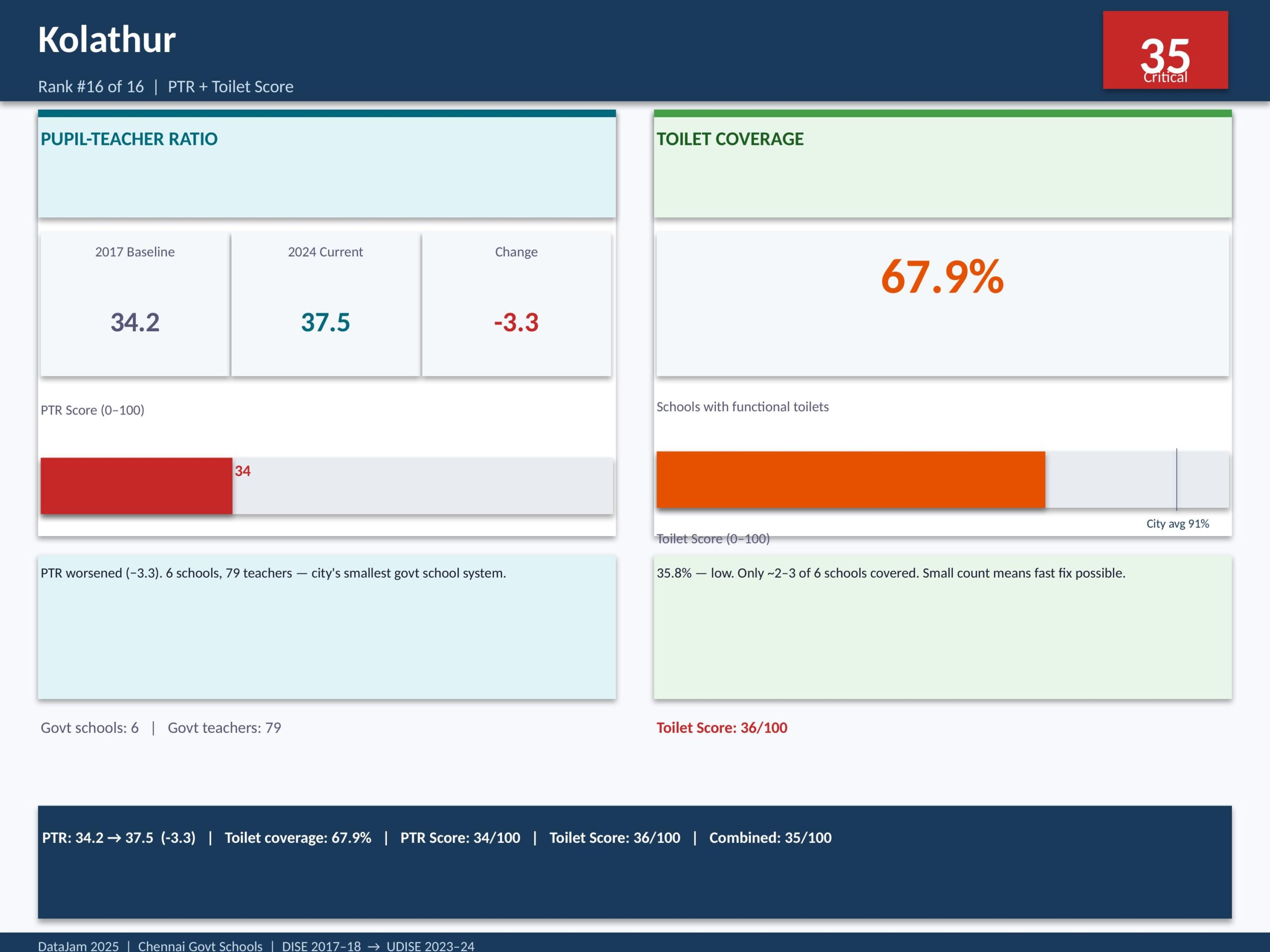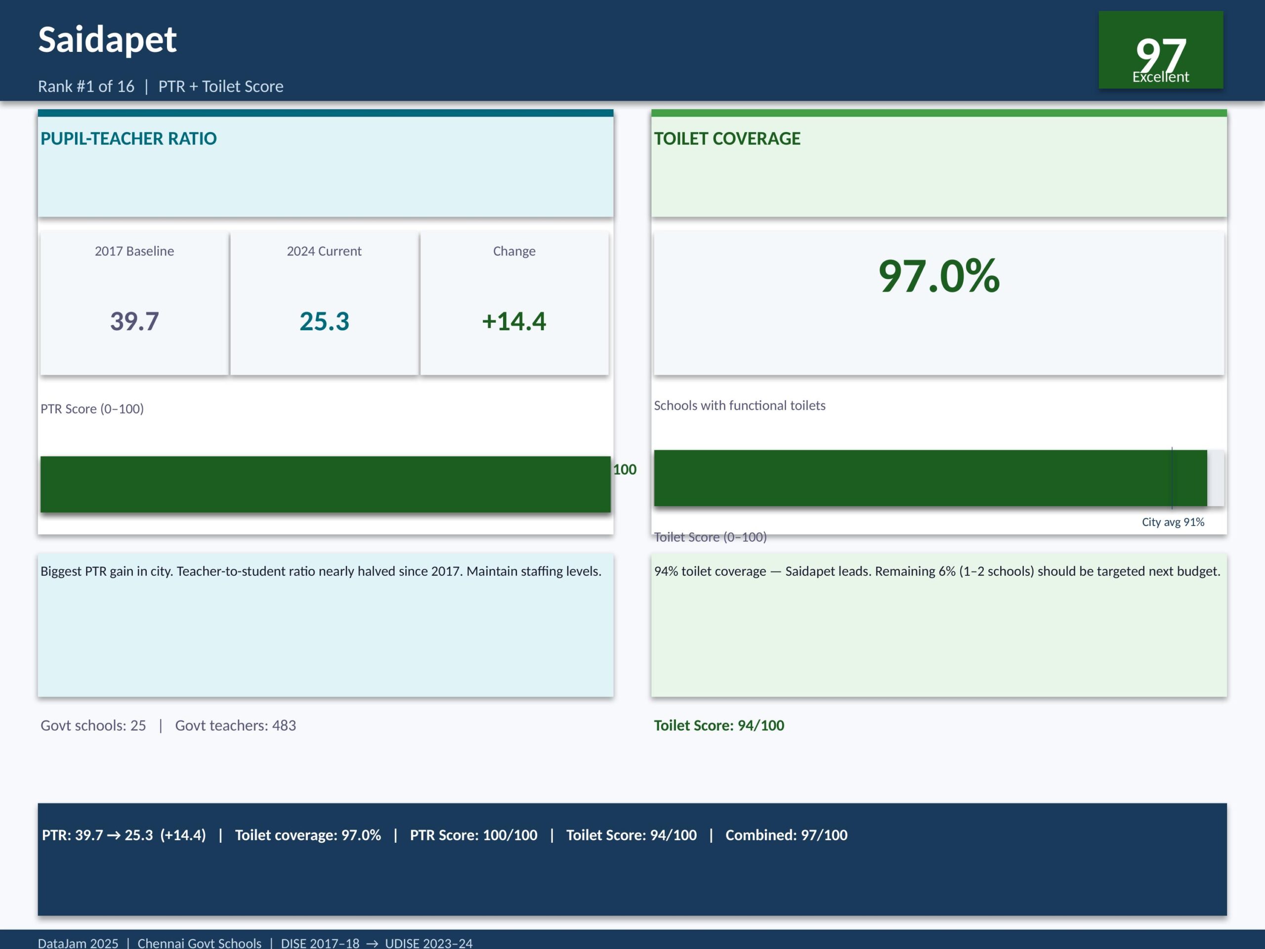 On March 28th 2026, OpenCity conducted a datajam in Chennai on the topic of Constituencies. Abdullah, Harini, Kathir, Prasanna and Santhosh looked at the state of government schools in the sixteen constituencies in Chennai district. They used data from the Unified District Information System for Education Plus (UDISE+) 2023-24, compared it with the equivalent data from 2017-18 to understand the change (improvement or deterioration) over the years.