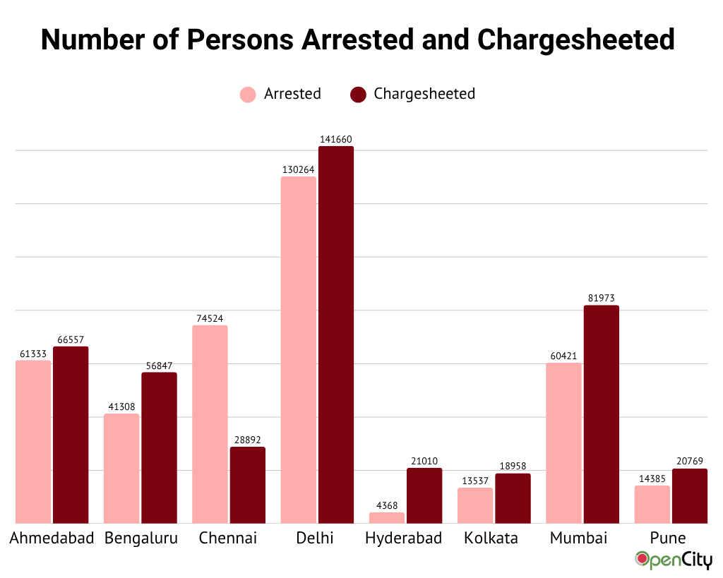 While the number of cases registered were high, the number of arrests and chargesheets show more parity between the cities. The number of persons arrested in Delhi was less than half the total number of cases and the number chargesheeted was only slightly more than the arrests.