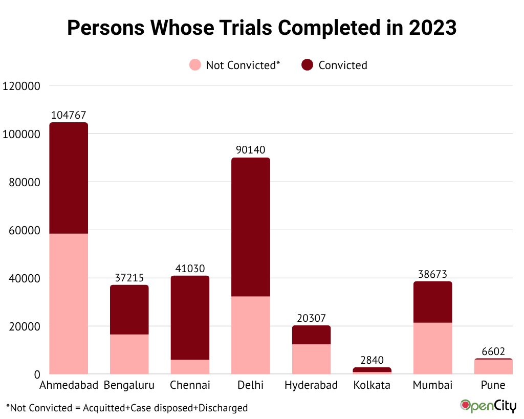 In 2023, far more cases completed trial in Ahmedabad than in any other city, and most of them ended without a conviction. This was followed by Delhi where most cases ended with a conviction. The number was extremely low in Pune and Kolkata which raises questions about the low and high conviction rates respectively in these cities.