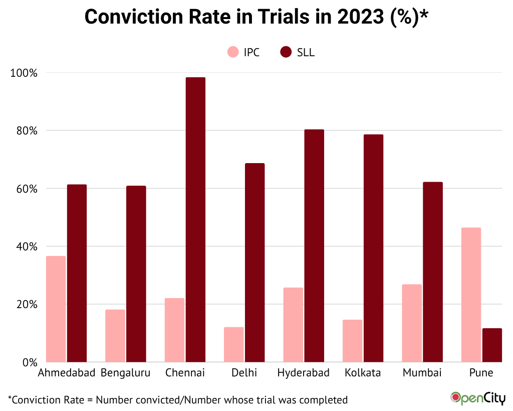 The vast difference between some cities, like Chennai and Pune can be seen in the cases that were prosecuted in court. In the case of most cities, trials under SLLs were more likely to end in conviction than IPC crimes. Only in Pune, the trend is reversed which also probably explains the low conviction rate.