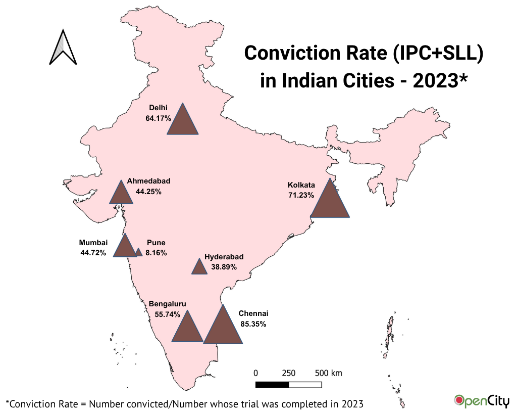 Conviction rates vary widely from a paltry 8% in Pune to 85% in Chennai, and the number of cases that finished trial also varies between 2000 odd in Kolkata to more than a lakh in Ahmedabad courts.