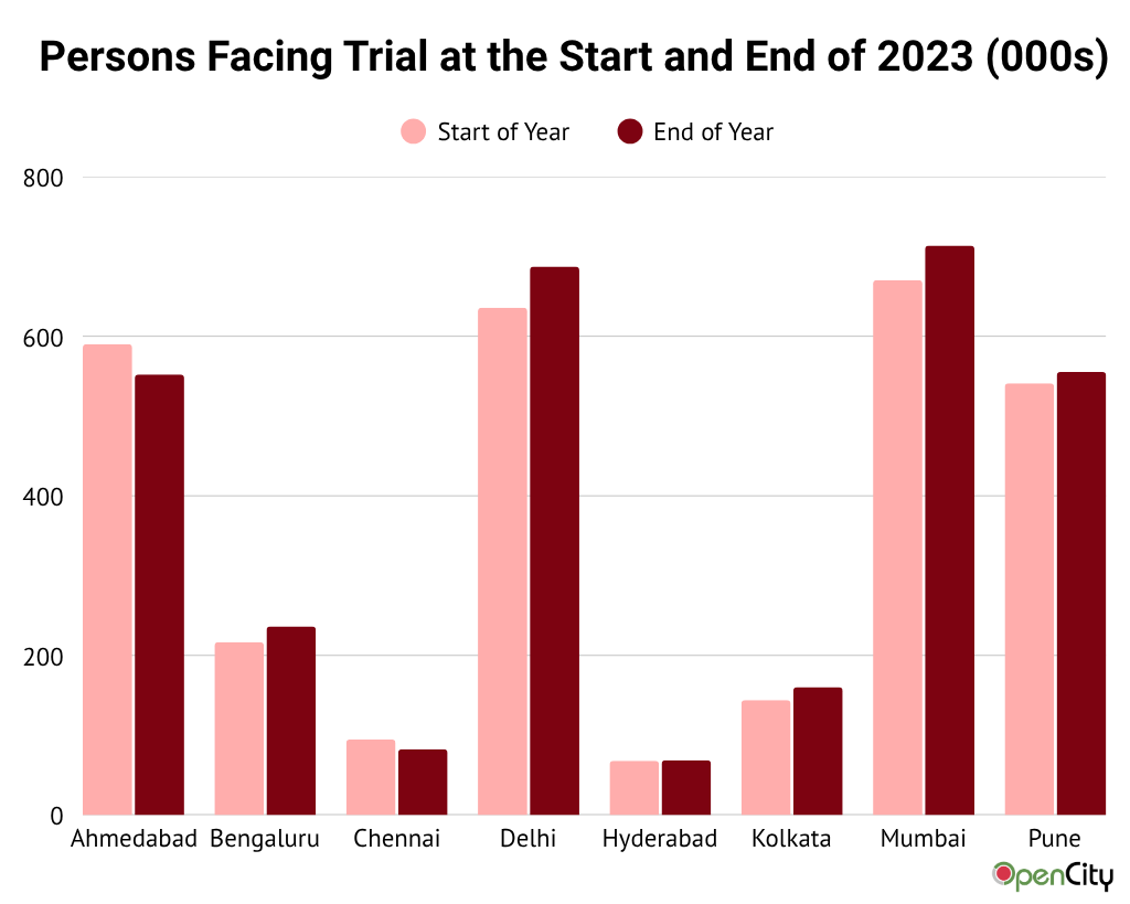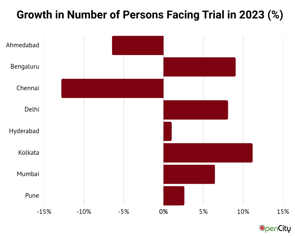 While Ahmedabad and Chennai were able to reduce the number of people facing trials, the number grew in the other cities, with a more than 10% growth in Kolkata, followed by Bengaluru and Delhi.