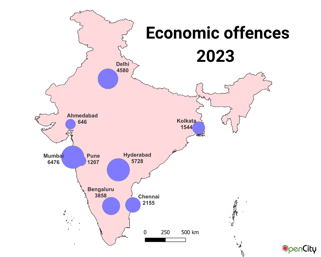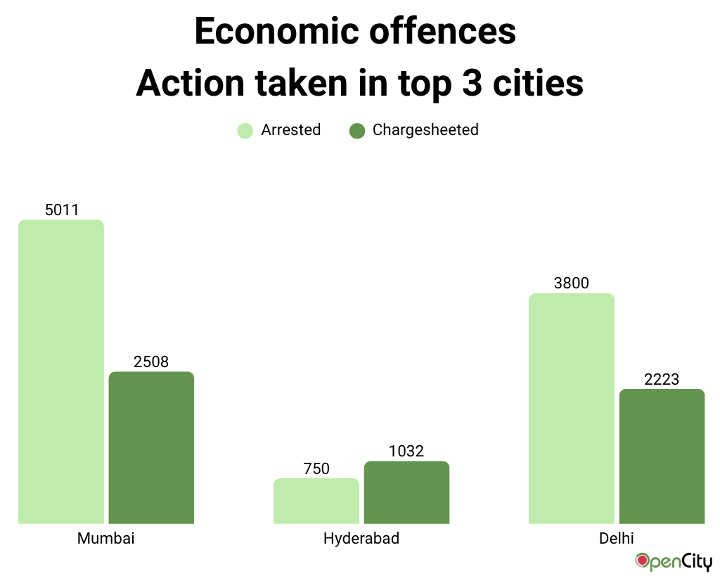 Economic offences include crimes like forgery, cheating and frauds that involve money. Mumbai, the financial capital of the country, leads with the highest number of economic offences registered, followed by Hyderabad and Delhi, who aren’t too far behind.