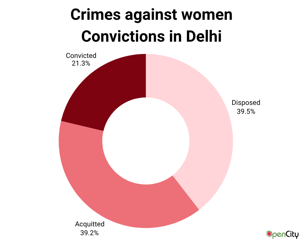 The prosecution of crimes against women in trials in Delhi, however, leaves much to be desired. Only 21% of those who went to trial for crimes against women were convicted in 2023. Alarmingly, close to 40% of the cases were disposed before reaching trial as the courts did not find the evidence or investigation worth proceeding with a trial.