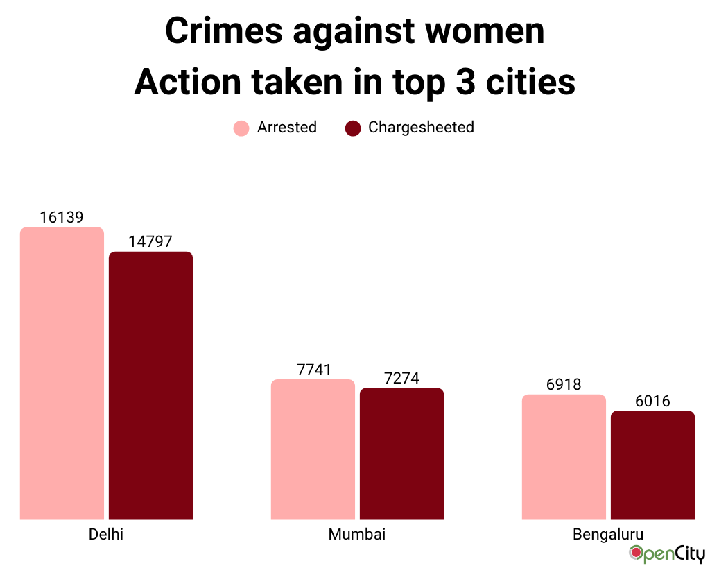 In the top three cities, Delhi, Mumbai and Bengaluru, the number of people arrested was higher than the number of cases and chargesheets have been filed for most of them. This suggests that the police are taking crimes against women seriously and are acting on them with urgency.