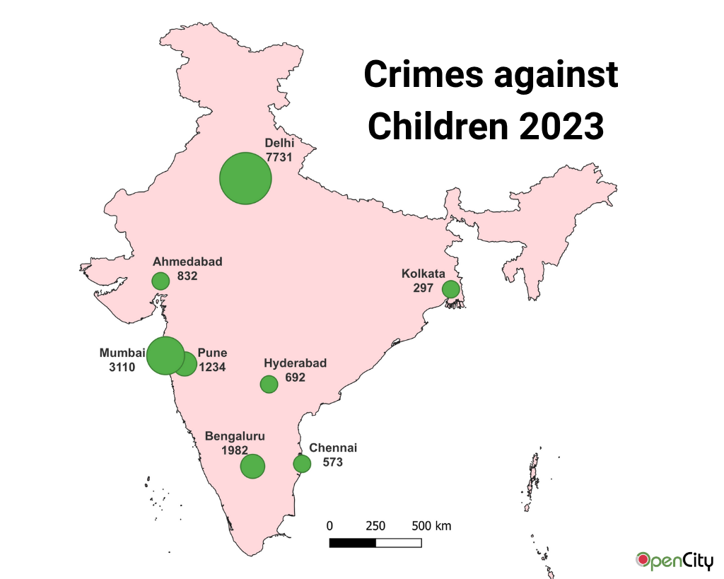 Similar to crimes against women, Delhi, Bengaluru and Mumbai lead the charts in crimes against children too. Once again, Delhi leads by a large distance compared to the next highest.