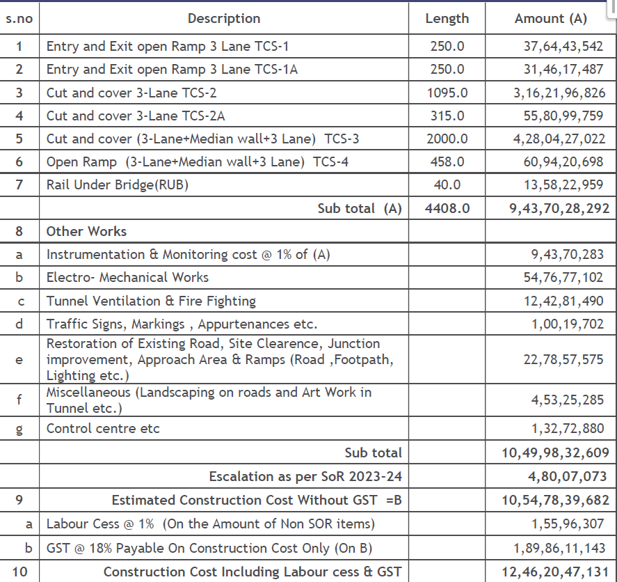 The total cost for the tunnel roads is estimated to be Rs. 1385.29 Cr.The construction of the tunnel alone is expected to cost Rs. 1246.20 Cr including GST.